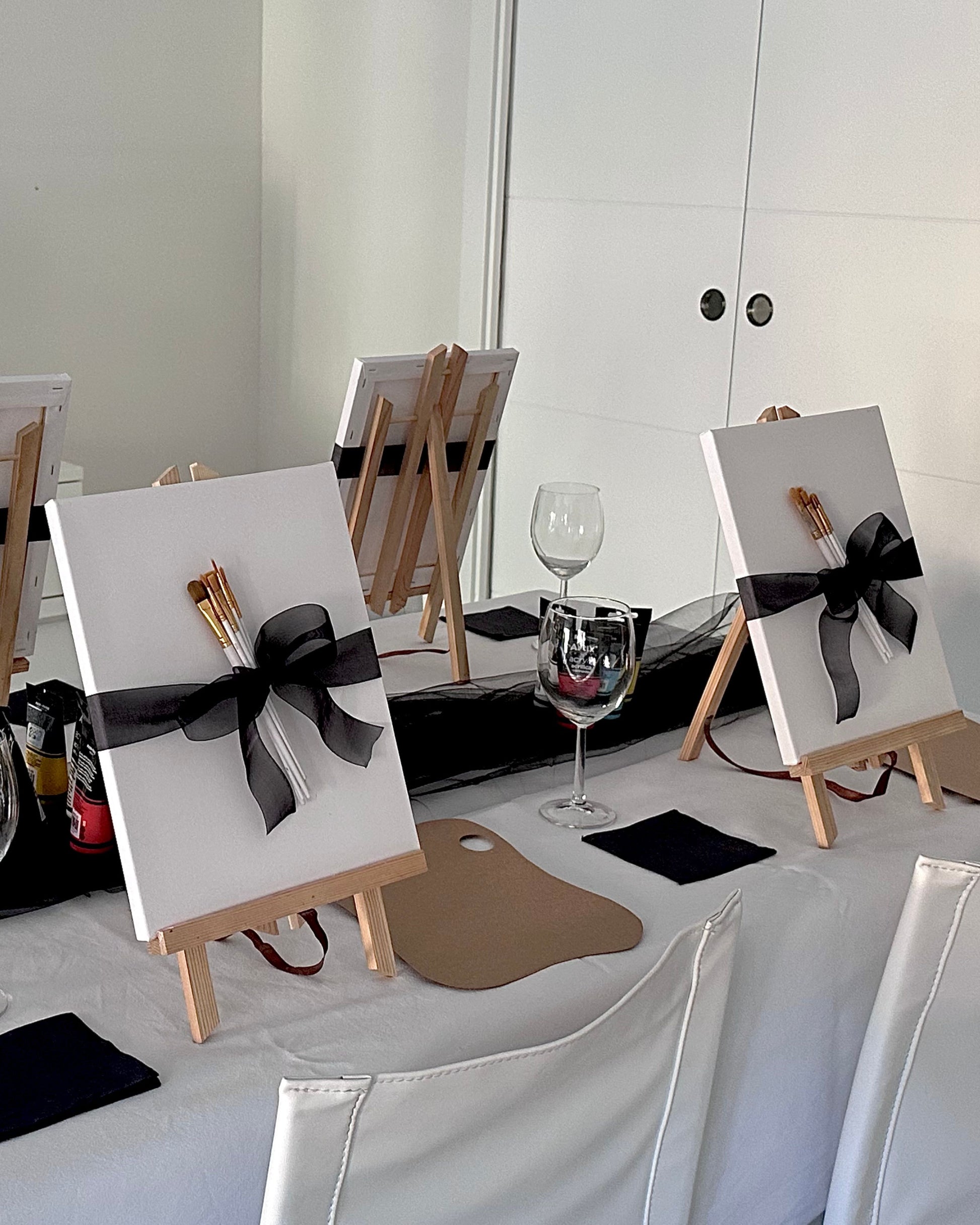 TODO. Todos los materiales (lienzo, pinturas, pinceles, paleta o cuentas, alambre, alicates, etc.), menaje (mantel, vasos, copas, mesa auxiliar, cubitera, etc.) y por supuesto los vinos y un pequeño picoteo.